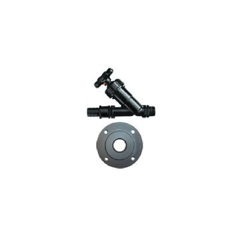 Este conjunto incluye una contrabrida de PP (Ø 150 mm) con racor de empalme hembra de 1” y un grifo de PP de 1” con entronque.