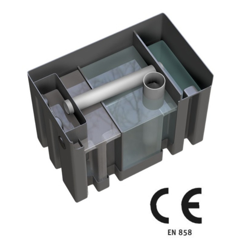 Separador de hidrocarburos híbrido con desarenador con un rendimiento de depuración de 0,1 mg/l de hidrocarburos a la salida. Los separadores de hidrocarburos con by-pass se usan para el tratamiento de aguas de escorrentía contaminadas con hidrocarburos (aparcamientos, talleres, carreteras, plantas industriales, etc.). Especialmente diseñado para el tratamiento de agua de lluvia. Fabricado de una pieza monobloque de polietileno de alta densidad (PEAD). Son imputrescibles, resistentes, no se oxidan ni se agrietan y resisten las variaciones de temperatura.