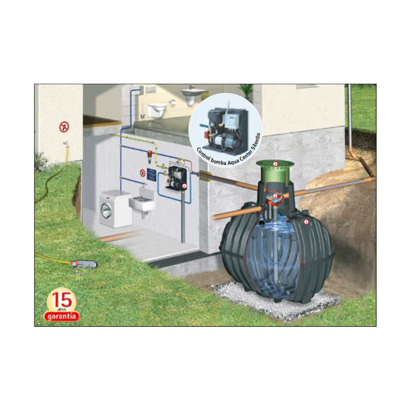 - Aqua Control. Controlador electrónico, indica el nivel de agua en el depósito y regula la entrada de agua potable al depósito si se vacía. Protege la bomba si falta agua. Controla la limpieza de los filtros autolimpiantes. Incluye electroválvula magnética de latón y 20 m de cable de datos.