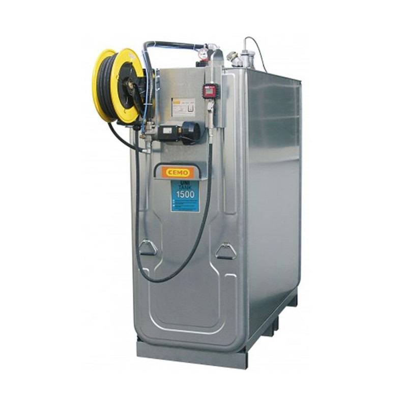 Depósito individual fabricado en HDPE (Polietileno de Alta Densidad), UNI 1500 litros CEMO, cubierta de chapa galvanizada. Bomba eléctrica 230 V 9 litros/min max. y 12 bar, carrete rebobinador con 15 metros manguera de distribución y contador de caudal digital, con soporte de pistola y vaso de goteo. Para el almacenaje en superficie de aceite usado o sin usar con un punto de ignición >55ºC. Accesorios de serie como patas de palé, indicador de nivel e indicador óptico de fugas, equipo de succión.