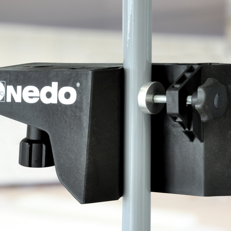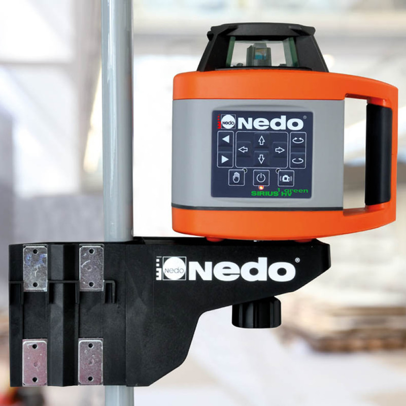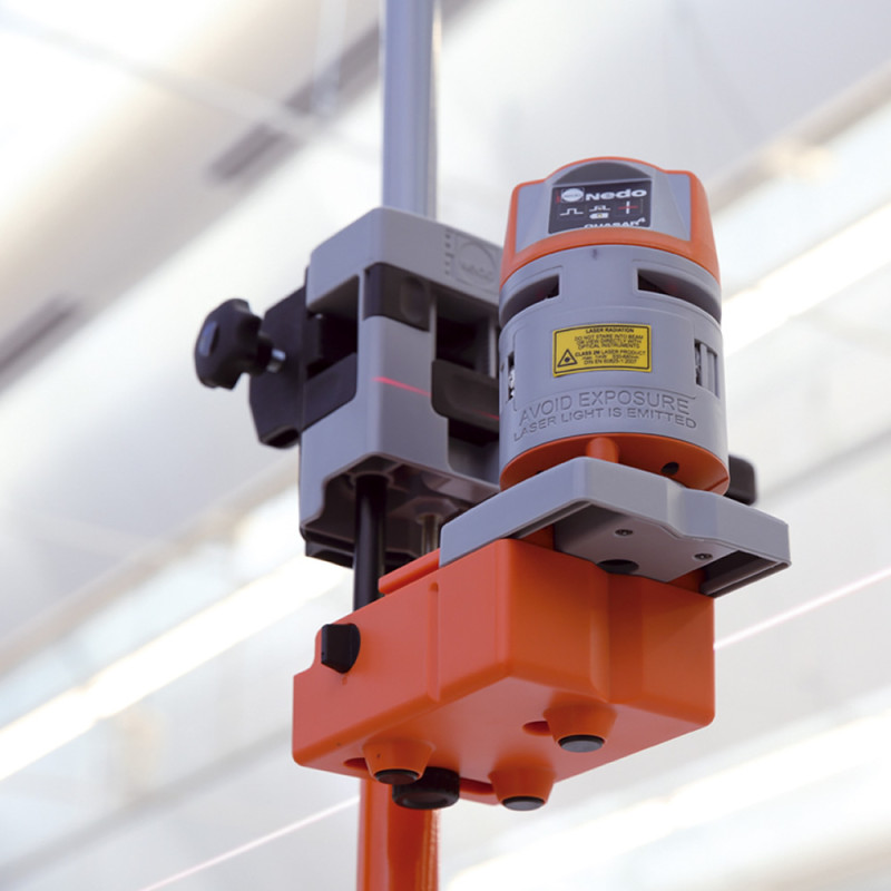 Barra telescópica de sujeción se enclava entre el suelo y el techo. El láser puede desplazarse en continuo hasta la altura de trabajo deseada.