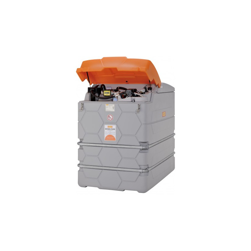 Depósito doble pared PE CUBE 1000 l para diésel, homologado para exteriores, bomba eléctrica 230 V / 72 L/min, carrete con manguera de 8 m y pistola de llenado con contador digital. Inspección de fabricación, Z- 40.21-510 aprobada.