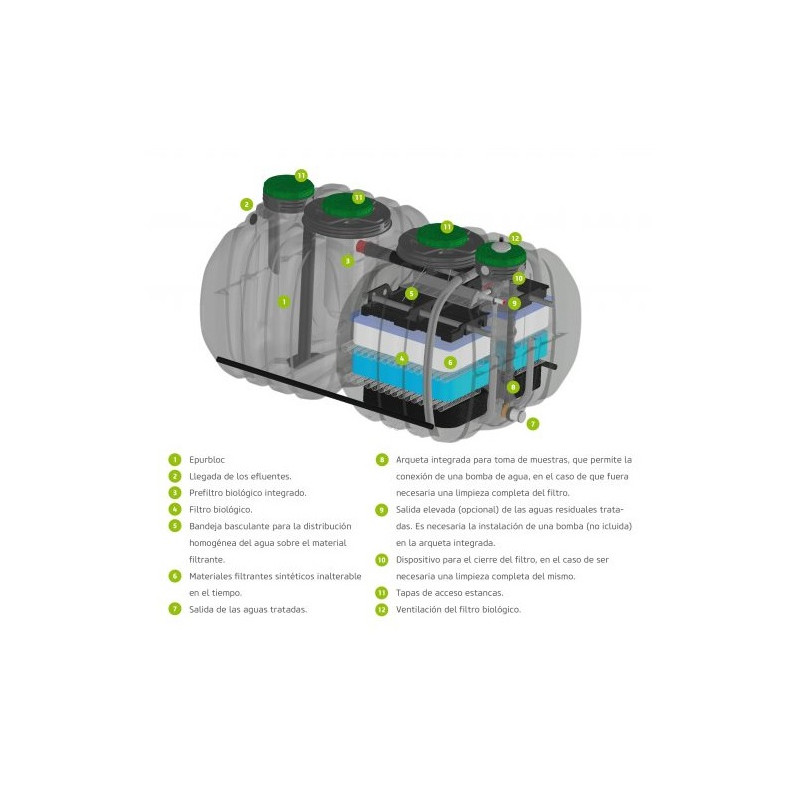En la composición del filtro biológico se utilizan unos materiales de relleno innovadores con los que se obtienen unos niveles de depuración excepcionales sin necesidad de energía eléctrica, al producirse de forma natural una oxidación del efluente a tratar.