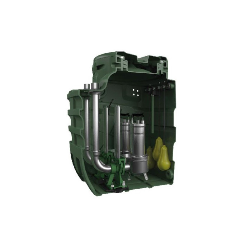 Incluye tapa desmontable y transitable (máx. 100 kg), dos bombas no automáticas monofásicas, dispositivo de elevación de las bombas, tres flotadores integrados en el depósito y cuadro electrónico de control con display digital para la protección y funcionamiento automático de las bombas.