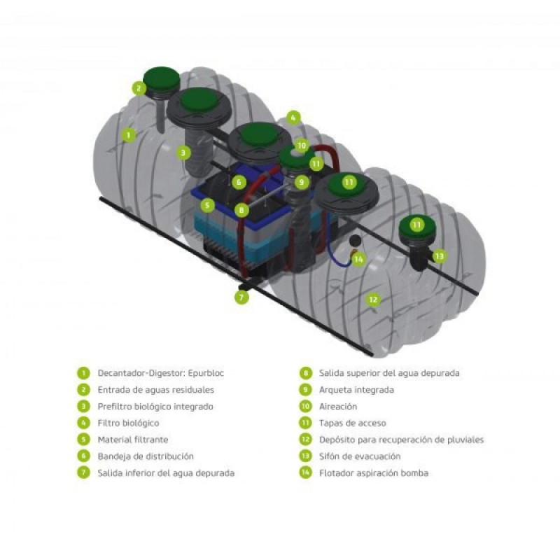 La gama Actifiltreo está diseñada para proporcionar una solución compacta, combinando en un mismo equipo, un sistema de tratamiento de aguas residuales Actifiltre y en un depósito para la recogida y aprovechamiento de agua de lluvia.
